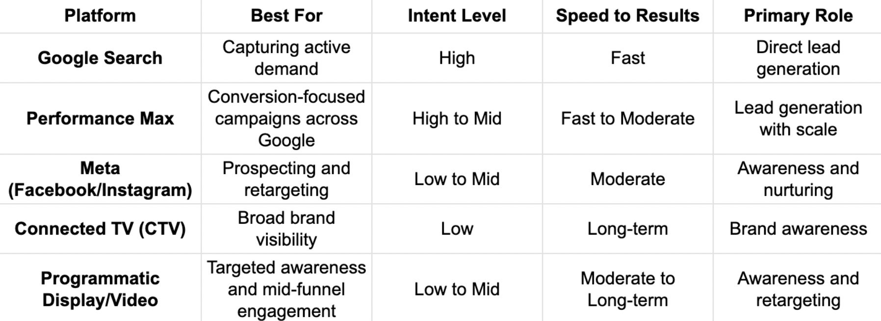 Lead generation platforms (Google Search, Performance Max, Meta retargeting) are designed to drive direct inquiries.